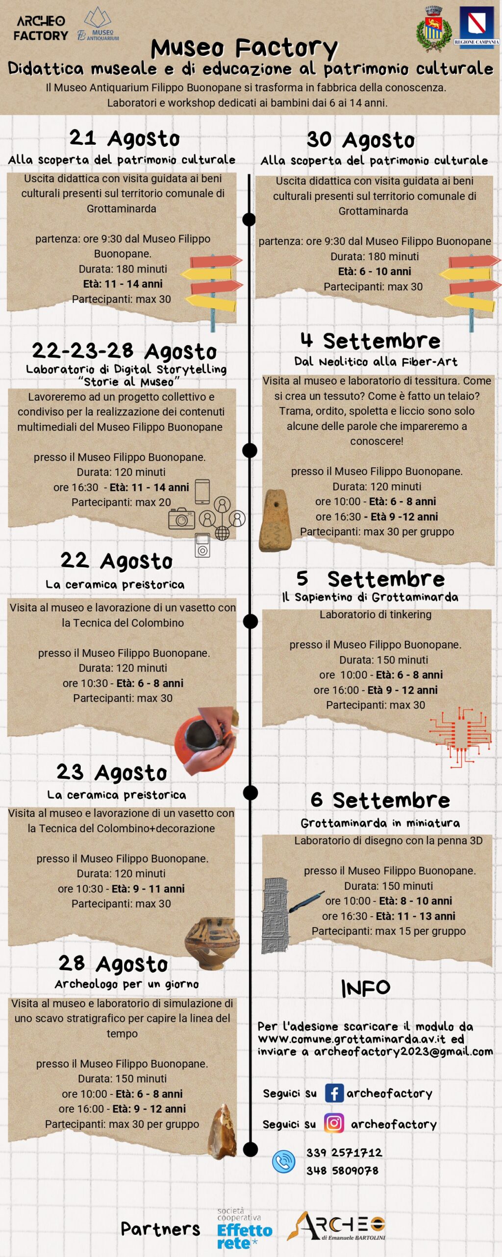 Visite ai beni culturali, laboratori sul Digital Storytelling, sulle stratificazioni archeologiche, su come si crea un tessuto o una ceramica preistorica, per fare solo qualche esempio delle tante attività dedicate ai bambini dai 6 ai 14 anni.