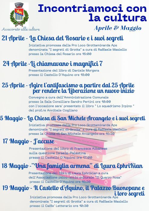 Aprile e maggio densi di appuntamenti interessanti a Grottaminarda grazie all’attivismo delle Associazioni ed al supporto dell’Amministrazione comunale e così l’Assessorato alla Cultura ha voluto racchiudere in un unico “cartellone” dal titolo “Incontriamoci con la Cultura”, tutte le iniziative in programma.