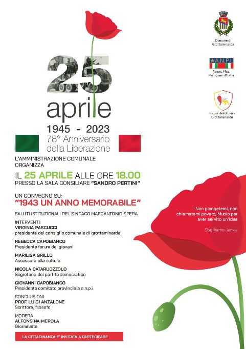 Dopo i saluti istituzionali del Sindaco, Marcantonio Spera, gli interventi di Virginia Pascucci, Presidente del Consiglio comunale di Grottaminarda, di Rebecca Capobianco, Presidente Forum dei Giovani, di Marilisa Grillo, Assessore alla Cultura del Comune di Grottaminarda, di Nicola Cataruozzolo, Segretario della locale sezione del Partito Democratico e di Giovanni Capobianco, Presidente del Comitato provinciale A.N.P.I., moderati dalla giornalista Alfonsina Merola. Le conclusioni saranno affidate al Professor Luigi Anzalone, Scrittore e filosofo.