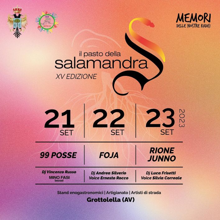 Nove punti spettacolo, tre importanti band del panorama musicale nazionale come 99 Posse, Foja e Rione Junno, una parte artistica di tutto rispetto con performer ed espositori provenienti anche da fuori regione e ovviamente la promozione dei prodotti tipici locali. Dopo le oltre ventimila presenze registrate lo scorso anno, Grottolella è pronta a bissare anche con quest’edizione de “Il Pasto della Salamandra”.