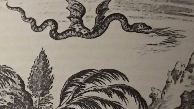 Da sempre l’uomo immagina che i monti siano abitati da animali e creature fantastiche. Un contadino sorpreso da un drago della Valle di Saas, in Svizzera. Le varie specie di Dracones Helvetici che abitano le Alpi sono descritti negli Itinera di Iacopo Scheuchzer, 1723.