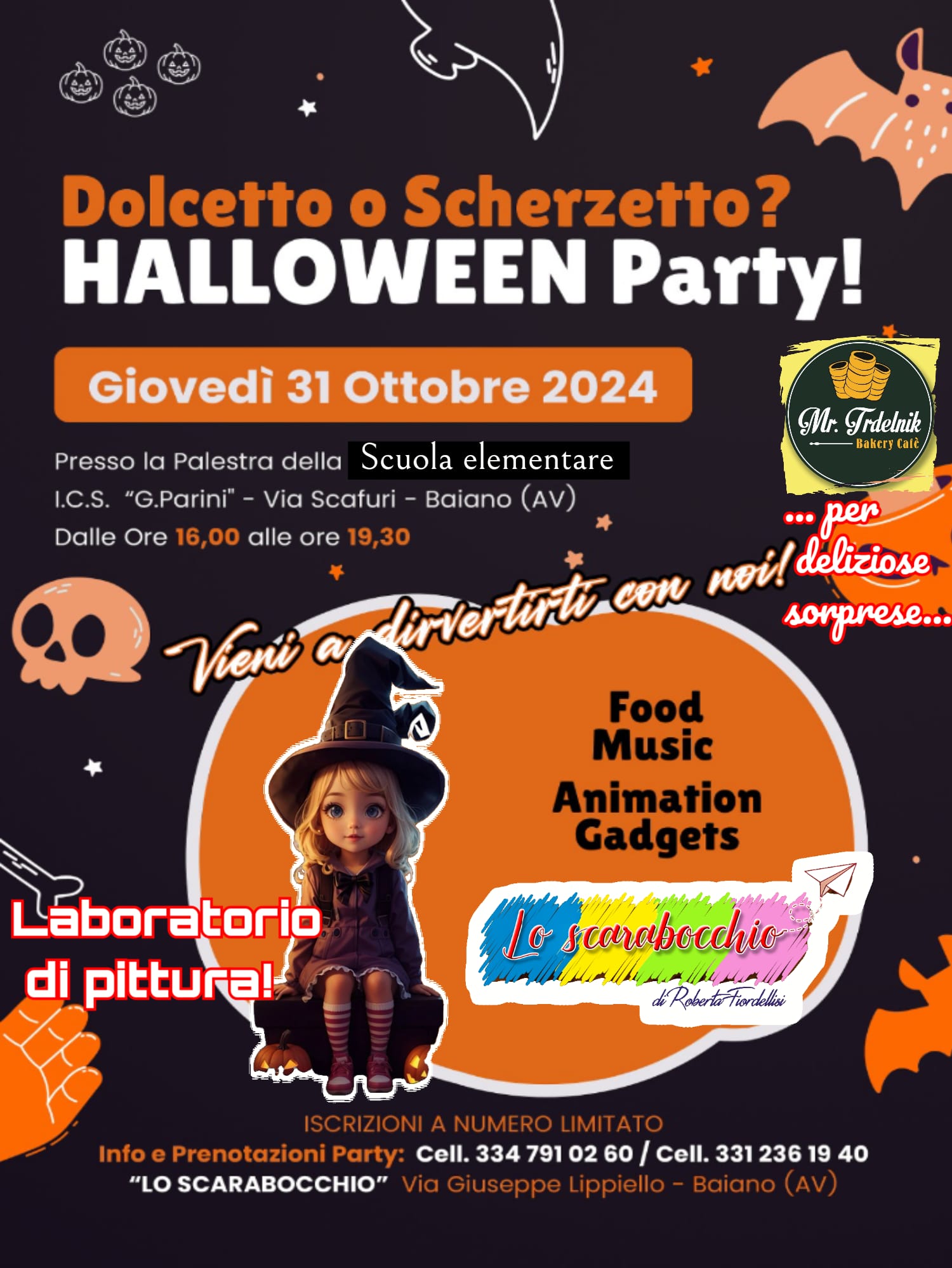 La cartolibreria “Lo Scarabocchio” di Roberta Fiordellisi organizza un evento speciale per Halloween, intitolato “Dolcetto o Scherzetto? Halloween Party!”, che si terrà giovedì 31 ottobre 2024, dalle ore 16:00 alle 19:30, presso la palestra della Scuola Elementare I.C.S. “G. Parini” a Baiano (AV).
