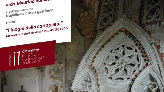 Dodici scatti che ripercorrono il percorso di promozione e valorizzazione della secolare Festa dei Gigli che, nell’arte della cartapesta, trova il suo naturale veicolo di identità. A rappresentarli è l’architetto Maurizio Barbato, autore di un calendario didattico incentrato sulla Festa Eterna che porta il titolo “I luoghi della cartapesta”. Il progetto è stato sostenuto dall’imprenditore nolano Francesco Napolitano e sarà presentato in anteprima alle ore 19 di martedì 11 dicembre nei locali dell’agenzia YesHome in via San Massimo a Nola. L’iniziativa si inserisce nell’ambito delle attività portate avanti in città in occasione del V anniversario del riconoscimento Unesco attribuito alla Rete delle Grandi Macchine a Spalla italiane e di cui la Festa dei Gigli di Nola è parte integrante insieme ai Candelieri di Sassari, alla Varia di Palmi e alla Macchina di Santa Rosa di Viterbo.