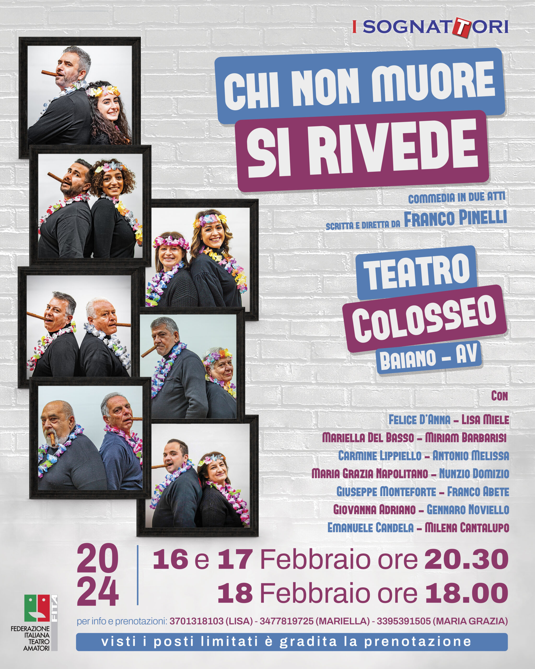 Lo spettacolo, Chi non muore si rivede, che vede la regia dello stesso Franco Pinelli andrà in scena 15, 16 e 17 febbraio, con i membri della compagnia de I Sognattori che sono pronti a regalare al pubblico una serata di puro intrattenimento.