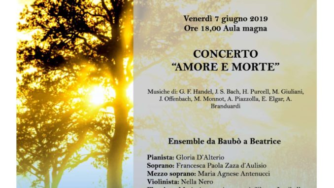 Il dibattito aprirà la penultima giornata di lezioni che si concluderà con il concerto dell’Ensemble “Da Baubò a Beatrice”, presso l’Aula Magna della Facoltà di via Petrarca, alle 18. La pianista Gloria D’Alterio, la soprano Francesca Paola Zaza d’Aulisio, la mezzo soprano Maria Agnese Antenucci, la violinista Nella Nero, le flautiste Maria Agnese Antenucci e Silvana Lucibello tradurranno in musica il rapporto “Amore e Morte” eseguendo composizioni di Handel, Bach, Purcell, Giuliani, Offenbach, Monnot, Piazzolla, Elgar, Branduardi. Prevista anche la partecipazione dei chitarristi e mandolinisti Franco Natale e Sergio Prozzo e del percussionista Franco Faraldo.