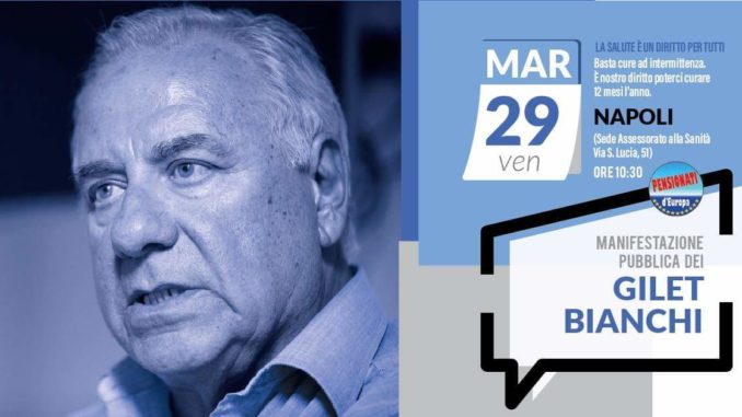 Venerdì 29 marzo si terrà a Napoli una manifestazione pubblica dei Gilet Bianchi, il movimento fondato dal Partito Pensionati d’Europa a difesa della dignità degli anziani e dei pensionati, delle famiglie, dei giovani e delle donne. “La salute è un nostro diritto, basta cure ad intermittenza!”: è questo lo slogan del flash mob che porterà i napoletani a protestare sotto la sede dell’Assessorato alla Sanità della Regione Campania (in via Santa Lucia, 51).“Il commissariamento della Sanità Campana non è servito a risolvere il problema dell’assistenza sanitaria per tutti i cittadini ed in particolare per gli anziani, i pensionati e le famiglie appartenenti alle fasce meno abbienti della popolazione campana – dichiara Fortunato Sommella, leader del Partito -. Il fatto che ogni tanto si inauguri qualche nuovo reparto risolve poco se non addirittura nulla, visto che ci sono decine di altri ospedali che soffrono in termini strutturali, per la mancanza di attrezzature e per le risorse umane non in grado (per numero e materiali a loro disposizione) di sopperire alle centinaia di emergente giornaliere”. “I centri convenzionati, poi, assicurano assistenza solo 8 mesi l’anno – continua Sommella -, ai due mesi di assistenza ne segue uno senza. L’importanza del tema merita grande partecipazione: non possiamo accettare cure ad intermittenza o a zona, è nostro diritto poterci curare 12 mesi l’anno!”.
