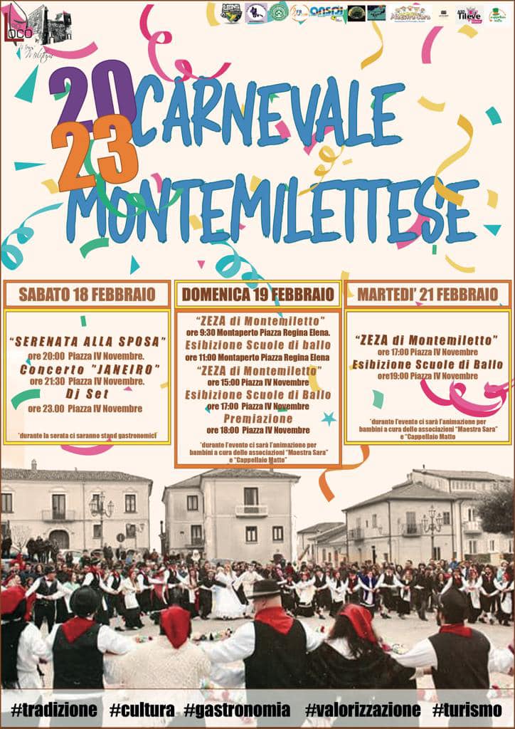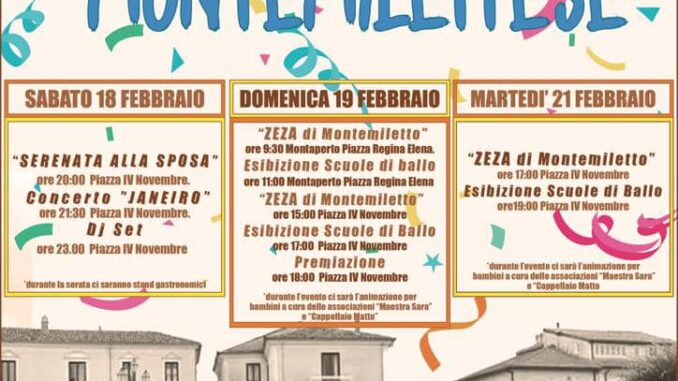 Montemiletto si prepara ad accogliere i festeggiamenti in onore del Carnevale che esplodono in un bagno di colori e balli folkloristici con la celebre ‘Zeza’ tutta montemilettese. Quest’anno la Proloco in collaborazione con le associazioni locali propone un calendario ricco di novità che abbracciano tradizione e divertimento per ogni fascia d’età. La Zeza infatti, interpretazione tragicomica del matrimonio montemilettese, fa spazio quest’anno alla celebrazione della ‘Serenata alla Sposa’ che si colloca tra le antichissime usanze popolari proprie del territorio. Questa viene ‘portata’ la sera prima del famoso matrimonio dallo sposo al cospetto della famiglia di lei, recitando pubblicamente la dichiarazione strimpellata al balcone allestito per l’occasione in piazza IV Novembre. La serata del 18 febbraio si scalderà successivamente con il gruppo itinerante dei Janeiro in concerto che renderanno gli spettatori matrice dei festeggiamenti, dando spazio in tarda serata al Dj Set. In occasione della Zeza domenica 19, che colora di mille sfaccettature Montemiletto, non mancherà la tappa a Montaperto, frazione del paese, che con il borgo antico farà da sfondo ai canti e balli che inonderanno le strade principali. Durante tutte le rappresentazioni che avranno luogo presso Piazza IV Novembre il 19 ed il 21 febbraio, attenzione verrà data ai più piccoli promuovendo divertimento ed aggregazione con animazione e giochi ad opera delle associazioni “Maestra Sara” ed “Il Cappellaio Matto”. Ulteriore spettacolo per i presenti si avrà grazie alla partecipazione degli allievi delle scuole di ballo ASD Tileve Dance e ASD Passion Dance in esibizione. Stand gastronomici accompagneranno l’intero evento e per i costumi sfoggiati durante la manifestazione verrà indetta una premiazione finale. Inclusività ed unione vengono coltivati anche in questa occasione con tutti i ragazzi diversamente abili partecipi in prima linea delle iniziative. “L’obiettivo è quello di rinnovare una manifestazione tradizionale come quella della Zeza per renderla un evento al passo con i tempi e che coinvolga sfere più ampie di popolazione” dichiara il presidente Florindo Garofalo “Collaborazione e spirito di iniziativa sono essenziali non solo per la realizzazione della singola manifestazione ma rappresentano il cuore della crescita e dell’evoluzione di ogni paese. Nell’era della tecnologia e dei social network il nostro più grande orgoglio deriva dalla viva collaborazione tra i più piccoli ed i più anziani del paese in nome del sano divertimento. L’idea di integrare innovazione alla tradizione nasce dall’esigenza di “svecchiare” un evento cardine della cultura montemilettese ammodernandolo senza in alcun modo privarlo della sua essenza.”