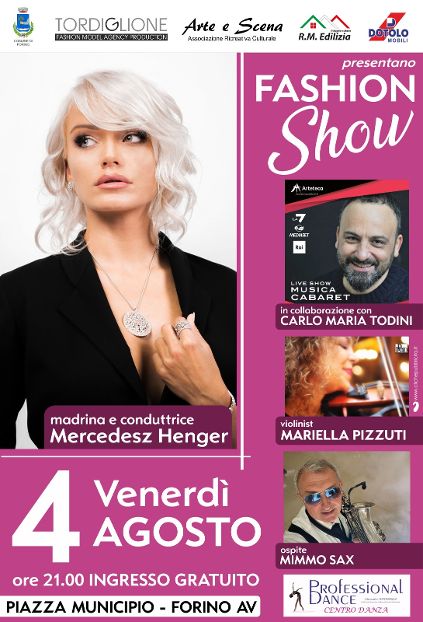 Una nuova tappa nel cartellone di eventi della Tordiglione Production. Il Fashion Show approda a Forino portando con sé moda, musica e cabaret. Madrina d’eccezione la bellissima e dolcissima Mercedesz Henger.