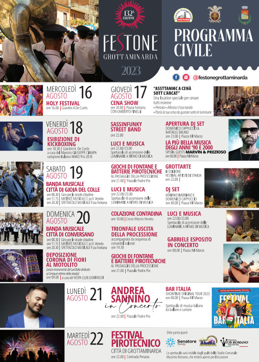 Domani, mercoledì 16 agosto, inizia il “Festone” di Grottaminarda. Sette giornate di festa popolare dedicate alla tradizione ma anche tante iniziative nuove. Ricchissimo il programma tra musica, luminarie, fuochi pirotecnici, attività sportive e riti religiosi: la cena aspettando l’accensione delle arcate, i concerti bandistici, i dj set, la strett band, i giochi di fontane, lo spettacolo anni 90, l’attesissimo concerto di Andrea Sannino, per menzionare solo qualcuno dei tanti appuntamenti organizzati dal Comitato Festone con il patrocinio della Parrocchia di Santa Maria Maggiore e del Comune di Grottaminarda.