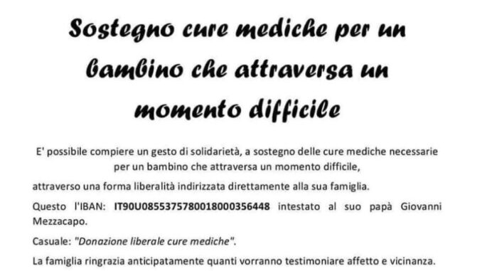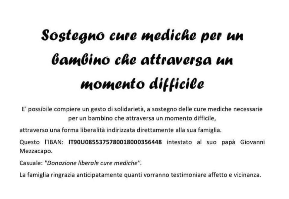 Chiunque volesse donare e quindi testimoniare realmente affetto e vicinanza a questa famiglia ricordiamo che può farlo versando sul conto intestato al suo papà Giovanni Mezzacapo all’Iban IT90U0855375780018000356448 indicando la causale “Donazione liberale cure mediche”.
