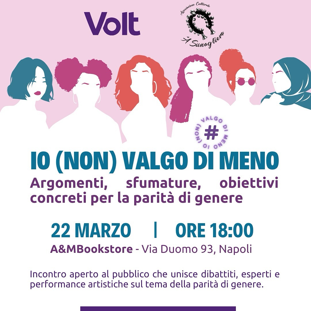 «Disparità salariale, accesso all’istruzione e alle opportunità di carriera, limite sulla libertà di scelta sul proprio corpo, stereotipi e violenza di genere sono solo alcune delle molte forme di discriminazione che le donne affrontano nel mondo di oggi». Parole di Mariateresa Passarelli, referente del Punto Viola Pomigliano di DonnexStrada, che venerdì 22 marzo dalle ore 18.00 presso la zona bar della libreria A&M Bookstore in Via Duomo 93, accanto al nuovo Vicolo della Cultura dedicato alle donne, sarà ospite dell’evento “Io (non) valgo di meno: argomenti, sfumature, obiettivi concreti per la parità di genere”, organizzato da Volt Campania.