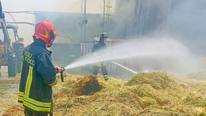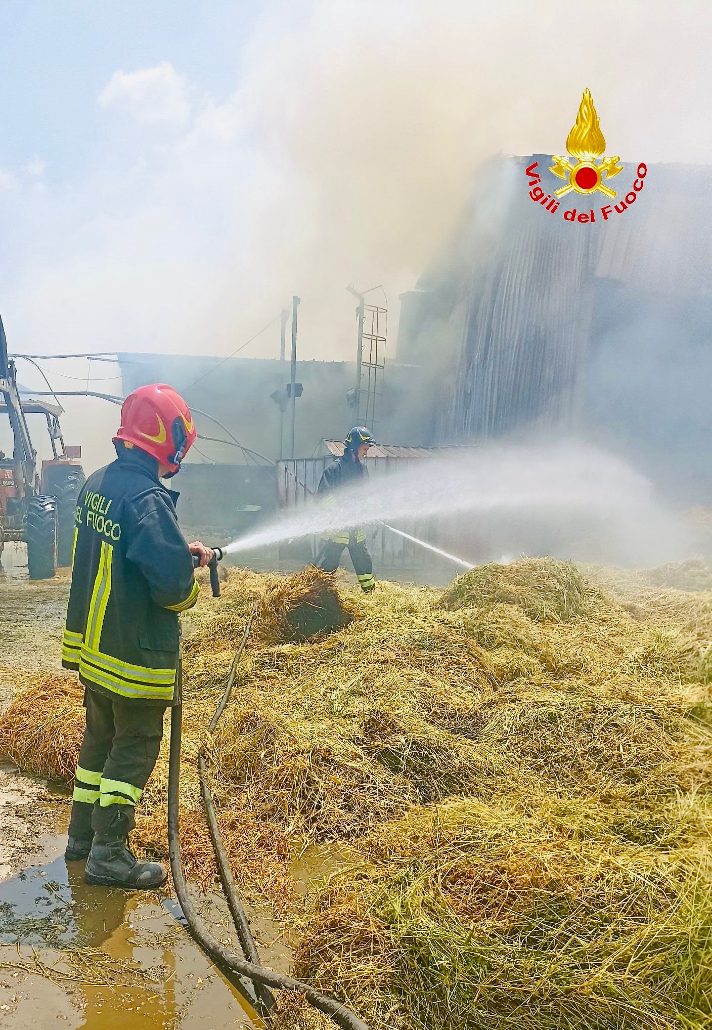 L’allarme è scattato intorno alle 11:30, quando il personale dell’azienda ha notato il fumo uscire dal fienile. La struttura, di circa 200 metri quadrati, conteneva oltre 250 rotoballe di fieno, diversi mezzi agricoli, attrezzi da lavoro e pannelli fotovoltaici installati sul tetto. Le fiamme si sono propagate rapidamente, alimentate dal materiale altamente infiammabile presente all’interno.