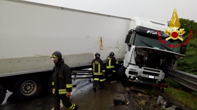 Subito dopo le ore 12’00 di oggi 23 luglio, i Vigili del Fuoco di Avellino sono intervenuti sull’autostrada A 16, Napoli-Canosa, al Km. 69,700, in direzione Napoli, nel territorio del comune di Venticano, per un incidente stradale che ha visto coinvolto un autoarticolato, che al momento non trasportava nulla, il quale sbandava e si metteva di traverso, occupando l’intera carreggiata. Il conducente, un uomo di circa 40 anni, rimaneva ferito, e veniva trasportato in ospedale per le cure del caso. Delicate le operazioni di recupero del pesante automezzo, vista anche una copiosa perdita di gasolio dal serbatoio. Disagi per la circolazione, rimasta bloccata sulla carreggiata Nord per il tempo necessario alle operazioni di soccorso.