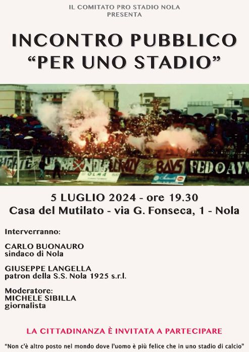 L’incontro è organizzato e promosso dal Comitato Pro Stadio Nola, nato qualche mese fa dall’iniziativa spontanea di tifosi, sostenitori e appassionati del Nola Calcio, con l’unico scopo di svolgere qualsiasi iniziativa, giuridicamente ammessa, per la costruzione di uno stadio cittadino e la ristrutturazione del complesso Sporting Club.