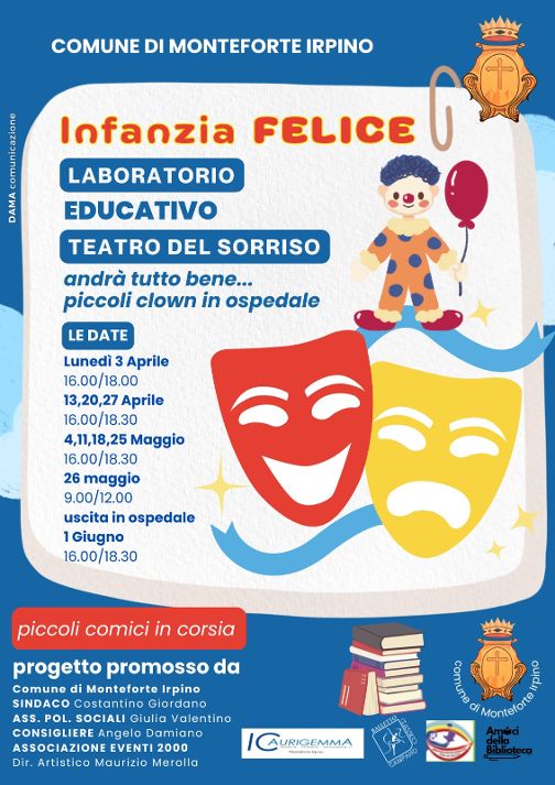 Infanzia Felice è il nuovo laboratorio ludico educativo dedicato alla clownterapia e alla terapia del sorriso, realizzato dal Comune di Monteforte Irpino e dall’Associazione “Monteforte Comicità”. Al corso parteciperanno gli alunni di alcune classi IV e V dei plessi scolastici dell’IC S. Aurigemma.