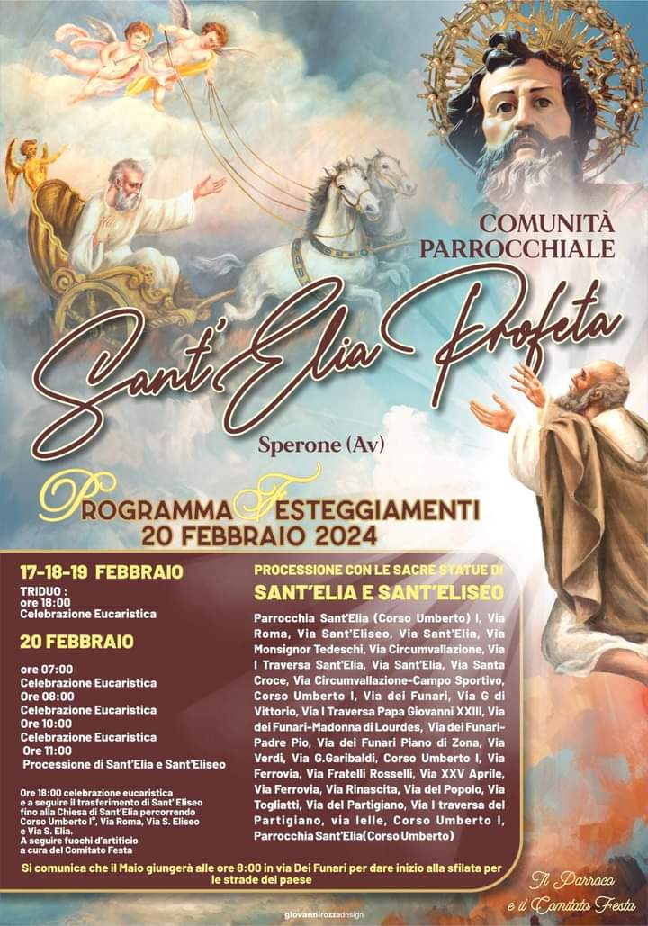 Sperone si prepara a vivere un intenso fine e inizio settimana di fede e tradizione con l’inizio del Triduo in onore di Sant’Elia Profeta, che avrà luogo dal 17 al 19 febbraio presso la chiesa parrocchiale del paese.