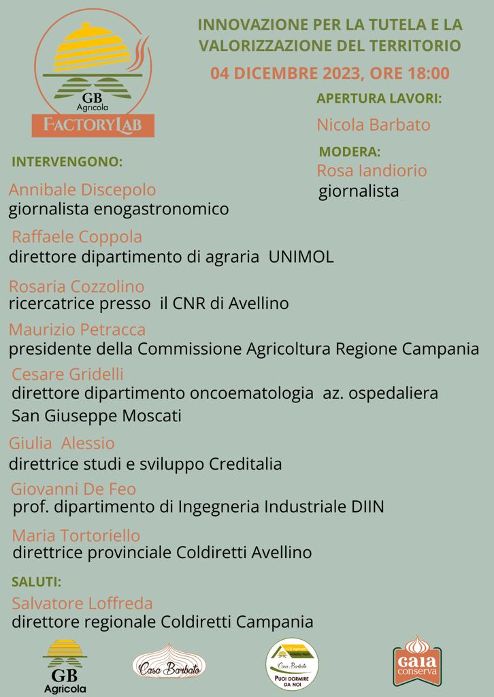 “Innovazione per la tutela e la valorizzazione del nostro territorio”. È questo il titolo del convegno che si terrà lunedì, 4 dicembre, alle 18.00, presso Casa Barbato, a Montoro (Av), in occasione dell’inaugurazione del Factory Lab – Gb Agricola.