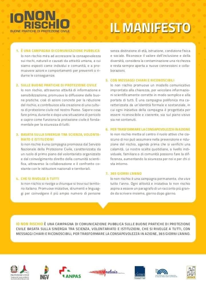 “Io non rischio” è la campagna di comunicazione nazionale sulle buone pratiche di protezione civile promossa dal Dipartimento di Protezione Civile. L’ obiettivo della campagna è quello di promuovere la conoscenza e la consapevolezza relativa al rischio e ai buoni comportamenti da tenere in condizioni emergenziali o di pericolo. “Io non rischio” è un sistema di divulgazione e promozione attivo trecentosessantacinque giorni l’anno, ma vedrà le proprie giornate dedicate sabato 14 e domenica 15 ottobre 2023 durante la settimana nazionale dedicata alla Protezione Civile. Squadre di volontari diffonderanno tra i cittadini delle piazze italiane prassi e attitudini idonee per tutelarsi nei più disparati scenari. Nel comune di Altavilla Irpina hanno aderito all’iniziativa il Gruppo Comunale di Protezione Civile “Massimo Ciccone” , con lo scenario di tipo alluvionale, e la sezione locale delle Misericordie d’Italia, con la prevenzione del rischio sismico. Nell’ambito della settimana della Protezione civile, inoltre, il “Massimo Ciccone” ha proficuamente frequentato i corsi di formazione previsti per i comunicatori del rischio e quelli riguardanti le maxi emergenze pediatriche.