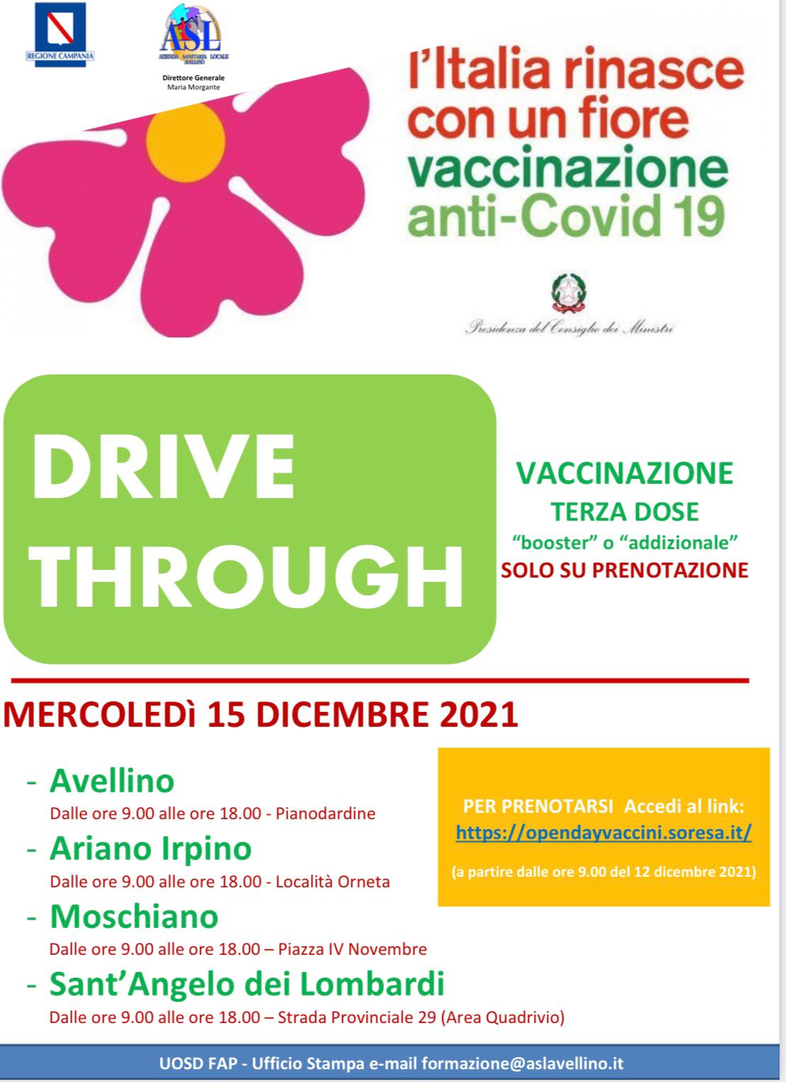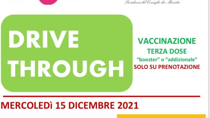A partire dalle ore 9.00 del 12 dicembre 2021 sarà possibile prenotarsi per la terza dose “booster” e “addizionale” del vaccino anti-Covid 19, fino ad esaurimento posti disponibili, presso i Drive through dell’Asl di Avellino.