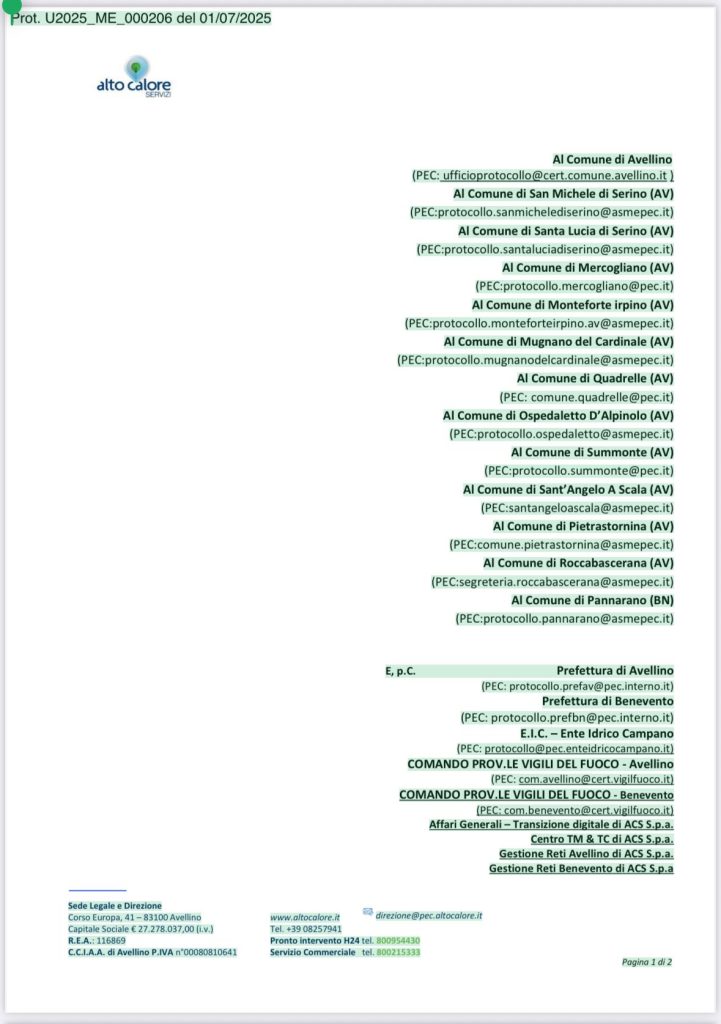 Il comunicato è stato inviato anche alle Prefetture di Avellino e Benevento, all’Ente Idrico Campano, ai Comandi Provinciali dei Vigili del Fuoco e ai comuni interessati, per garantire una corretta diffusione delle informazioni.