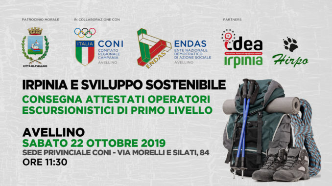 Sabato 19 Ottobre, alle ore 11.30, ad Avellino, presso la sede provinciale del CONI, in via Morelli e Silvati n°84, avrà luogo la manifestazione “Irpinia e Sviluppo Sostenibile” in occasione della quale verranno consegnati gli attestati a coloro che hanno conseguito il titolo di “operatore escursionistico di primo livello ENDAS”.