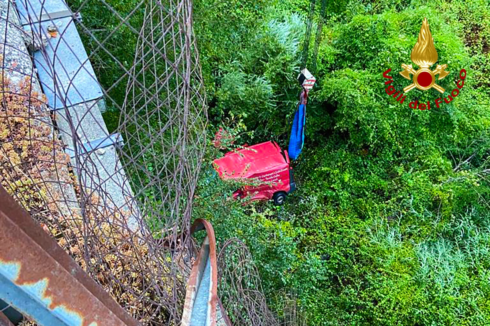 La squadra dei Vigili del Fuoco del distaccamento di Lioni, intorno alla mezzanotte di ieri 4 agosto, è intervenuta sulla SP 691, denominata Fondo Valle Sele, al Km. 18,200 in direzione Lioni, nel territorio del comune di Calabritto, per un incidente stradale che ha visto coinvolto un furgone il quale sbandava, rompeva la protezione del cavalcavia e precipitava per un’altezza di più di 30 metri. Alla guida del veicolo un uomo di 34 anni originario di Calabritto, il cui corpo privo di vita è stato recuperato con il supporto di una squadra S.A.F. (speleo – alpino – fluviale) intervenuta dal distaccamento di Eboli, Comando di Salerno. Si è reso necessario anche l’intervento dell’autogru dalla sede centrale del Comando di via Zigarelli. Sul posto oltre i sanitari del 118, a cui è stato affidato il corpo dopo il suo recupero, anche i Carabinieri della stazione di Calabritto e della Radiomobile di Montella, per i rilievi di propria competenza.