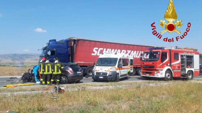 La squadra dei Vigili del Fuoco del distaccamento di Bisaccia, subito dopo le ore 12’00 di oggi 12 settembre, è intervenuta a Conza Della Campania, sulla SS 7 BIS, in prossimità della diga, per un incidente stradale che ha visto coinvolta un’autovettura e un camion che trasportava cartoni. Nel violento impatto la donna alla guida dell’auto, originaria di Morra De Sanctis, di 44 anni, è rimasta incastrata nell’abitacolo, ed è stato necessario tagliare le lamiere per liberarla. I sanitari del 118 intervenuti, vista la distanza dall’ospedale Moscati di Avellino, hanno fatto intervenire l’eliambulanza per il trasporto della malcapitata. L’atterraggio è stato predisposto presso il campo CONI, dove una squadra della sede centrale di Avellino ha fatto assistenza al velivolo in fase di atterraggio e decollo.