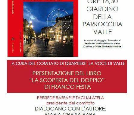 Franco Festa presenta, in anteprima, a Valle – la sua comunità – il suo ultimo lavoro “La Scoperta del Doppio”: un noir che parla di Avellino in metafora e neanche tanto. L’autore ha chiesto al comitato civico “La Voce di Valle” di costruire la cornice di questa iniziativa inedita, immaginata per uscire dai consueti salotti di discussione per portare il confronto, la riflessione, la lettura per le strade, tra la gente.