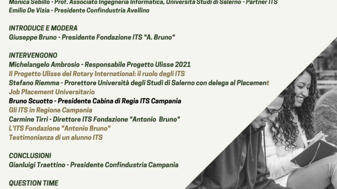 Parteciperanno all’evento Michelangelo Ambrosio (Responsabile del Progetto Ulisse 2021), Giuseppe Bruno (Presidente dell’ITS Fondazione “Antonio Bruno”), Emilio De Vizia (Presidente Confindustria Avellino), Rosa Grano (Dirigente Ufficio Scolastico Provinciale), Stefano Riemma (Prorettore dell’Università degli Studi di Salerno con delega al Placement), Bruno Scuotto (Presidente Cabina di Regia ITS Campania: Gli ITS in Regione Campania), Monica Sebillo (Docente dell’Università degli Studi di Salerno), Carmine Tirri (Direttore ITS Fondazione “Antonio Bruno”) e Gianluigi Traettino (Presidente Confindustria Campania).