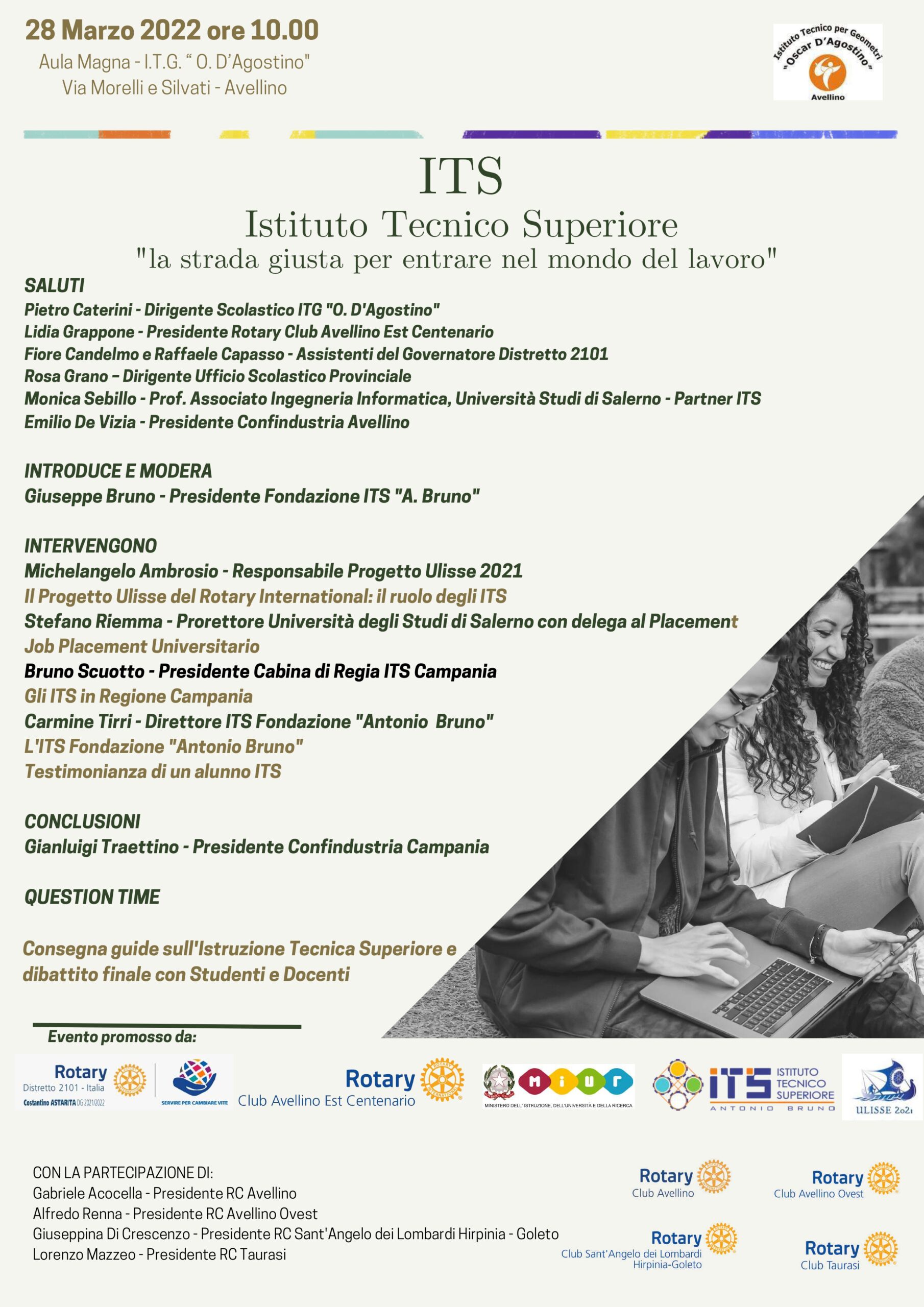 Si terrà lunedì 28 Marzo, alle ore 10:00, presso l’Istituto per Geometri “D’Agostino” sito in Via Morelli e Silvati ad Avellino, l’incontro promosso dal Rotary Club Avellino Est Centenario, con la partecipazione di tutti i Rotary Club della provincia di Avellino, dal titolo “ITS – Istituto Tecnico Superiore: la strada giusta per entrare nel mondo del lavoro”.