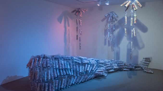 Risultato finale del progetto, intitolato SostenART, è una grande installazione realizzata con bottiglie di plastica che contengono i messaggi criptati composti dai bambini (il laboratorio infatti ha invitato i partecipanti a scrivere un testo a più mani grazie alla tecnica del “Cadavre exquis”, poi tradotto secondo un codice colore e inserito appunto in una bottiglia di plastica), curata dagli artisti Lucy + Jorge Orta, celebri nel mondo per le loro campagne di sensibilizzazione verso lo sviluppo sostenibile del pianeta, ed esposta presso la Collezione Peggy Guggenheim in occasione della mostra che ha aperto nei giorni scorsi e sarà visitabile fino al 17 aprile 2017. L’installazione è una riflessione attorno al riutilizzo sostenibile, oltre che artistico, della plastica, e, al contempo, un invito a trasmettere un SOS per la salvaguardia della vita degli oceani tramite un metaforico messaggio in bottiglia.