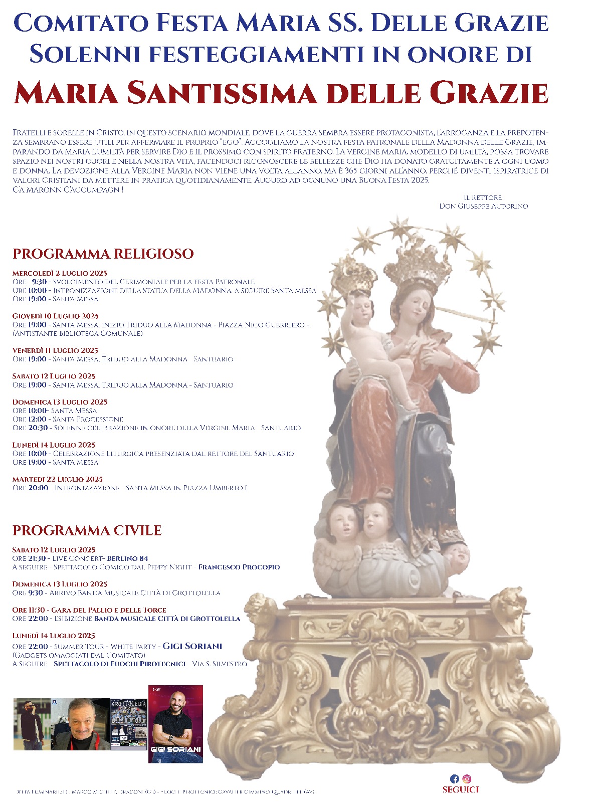 Luglio a Mugnano del Cardinale è sinonimo di festa, fede e comunità. Tornano i solenni festeggiamenti in onore di Maria Santissima delle Grazie, patrona amata e venerata. Un appuntamento sentito da tutta la popolazione e capace di attirare visitatori da tutta l’Irpinia e oltre.
