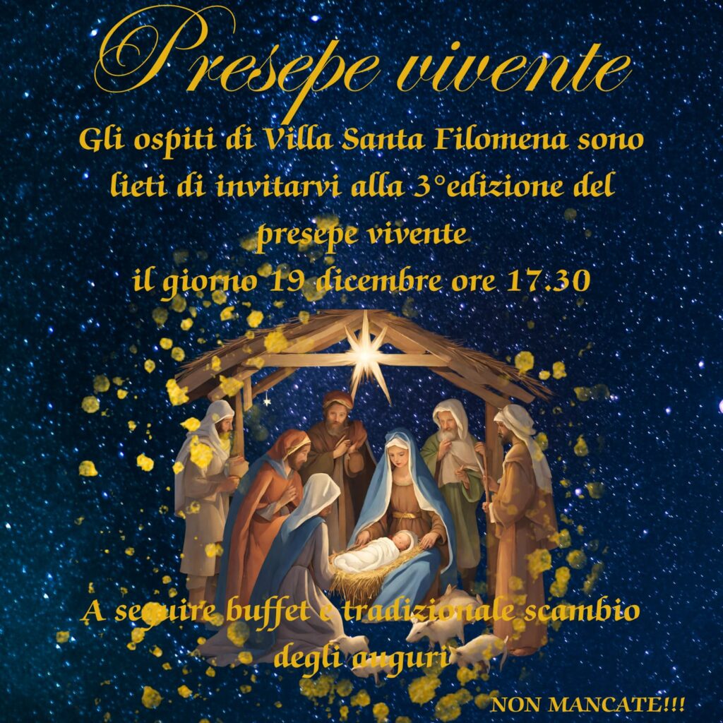 Costumi, musiche, parole e sentimenti si fondono per la sacra nascita, un momento prezioso per tutti gli ospiti del centro per disabili Santa Filomena che vivono questi giorni importanti intensamente con senso di condivisione, stupore ,semplicità e gioia. E l’occasione per augurare a tutti un sereno Natale con la speranza che la nascita di Gesù porti gioia a tutti i cuori. Il giorno 19 dicembre ore 17:30 presepe vivente Villa Santa Filomena”.