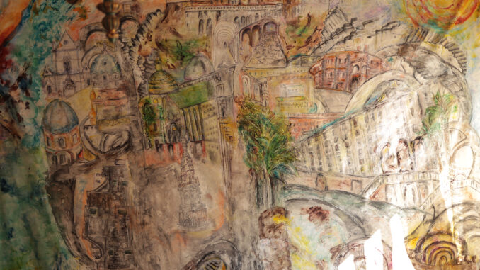 Per me il 2020 è stato un anno molto proficuo, molto più tranquillo del solito, e ho potuto pianificare i miei pomeriggi di lavoro senza molte pressioni e scadenze, per cui ho prodotto vari dipinti su tela, parecchi articoli mandati in video conferenza e due libri molto impegnativi: uno sulle tre religioni del Libro in lingua inglese e l’altro sulle fiabe e i miti. Quello sulle fiabe, che avevo già iniziato prima della pandemia, vale a dire nell’ottobre 2019, ha poi seguito un andamento un po’ diverso, facendosi influenzare dai risvolti negativi dell’ambiente naturale, condizionato anche dal COVID 19. Forse non potendo più uscire come prima, ho sentito il bisogno di ripercorrere almeno con la memoria tutti quei vicoli e quelle scalinate che dal Vomero mi portavano alle varie sedi dell’Orientale (ieri sale cinematografiche, oggi 4 Palazzi storici: Giusso, Corigliano, Santa Maria Porta Coeli, Palazzo del Mediterraneo) sia quando ero studentessa di Lingue e Letterature Straniere, sia in seguito quando sono diventata Ricercatrice. E dipingendo questa immensa tela di 3.20 x 2.70 ho ripercorso non solo tutta la città ma anche tutta la mia vita. Le scale, a volte strette altre volte larghe, si intrecciano ai vicoli in sentieri tortuosi e infidi, e ti fanno scendere con il fiato sospeso quando per la pioggia diventano scivolose, e non ti danno nemmeno il tempo di ammirare quegli squarci di cielo e mare, o quelle cupole gigantesche delle chiese che si susseguono numerose. Si, quelle cupole che sembrano sproporzionate in confronto ai palazzi neri e malandati che si intrecciano tra di loro; quelle cupole maestose di cui di tanto in tanto solo degli spicchi fanno capolino tra i palazzi alti dei vicoli dietro Piazza Mazzini.