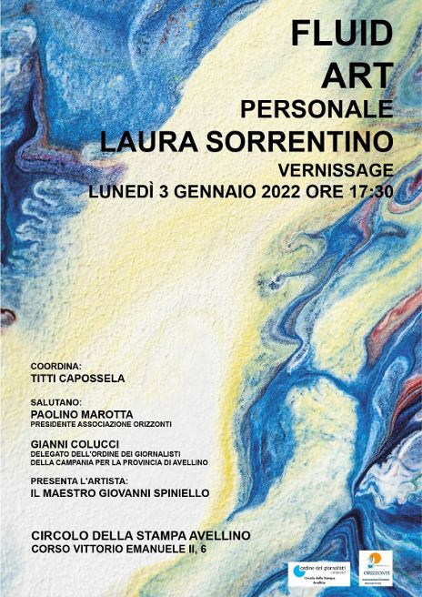 L’associazione culturale “Orizzonti” e l’Ordine dei Giornalisti di Avellino patrocinano il percorso espositivo “Fluid art” della giovane artista Laura Sorrentino che, dopo il successo della prima personale a Torre del Greco, sceglie Avellino come seconda tappa della sua mostra, aperta al pubblico dal 3 al 5 gennaio presso il Circolo della Stampa (Corso Vittorio Emanuele II, 6) dalle 10.00 alle 13.00 e dalle 17.00 alle 20.00