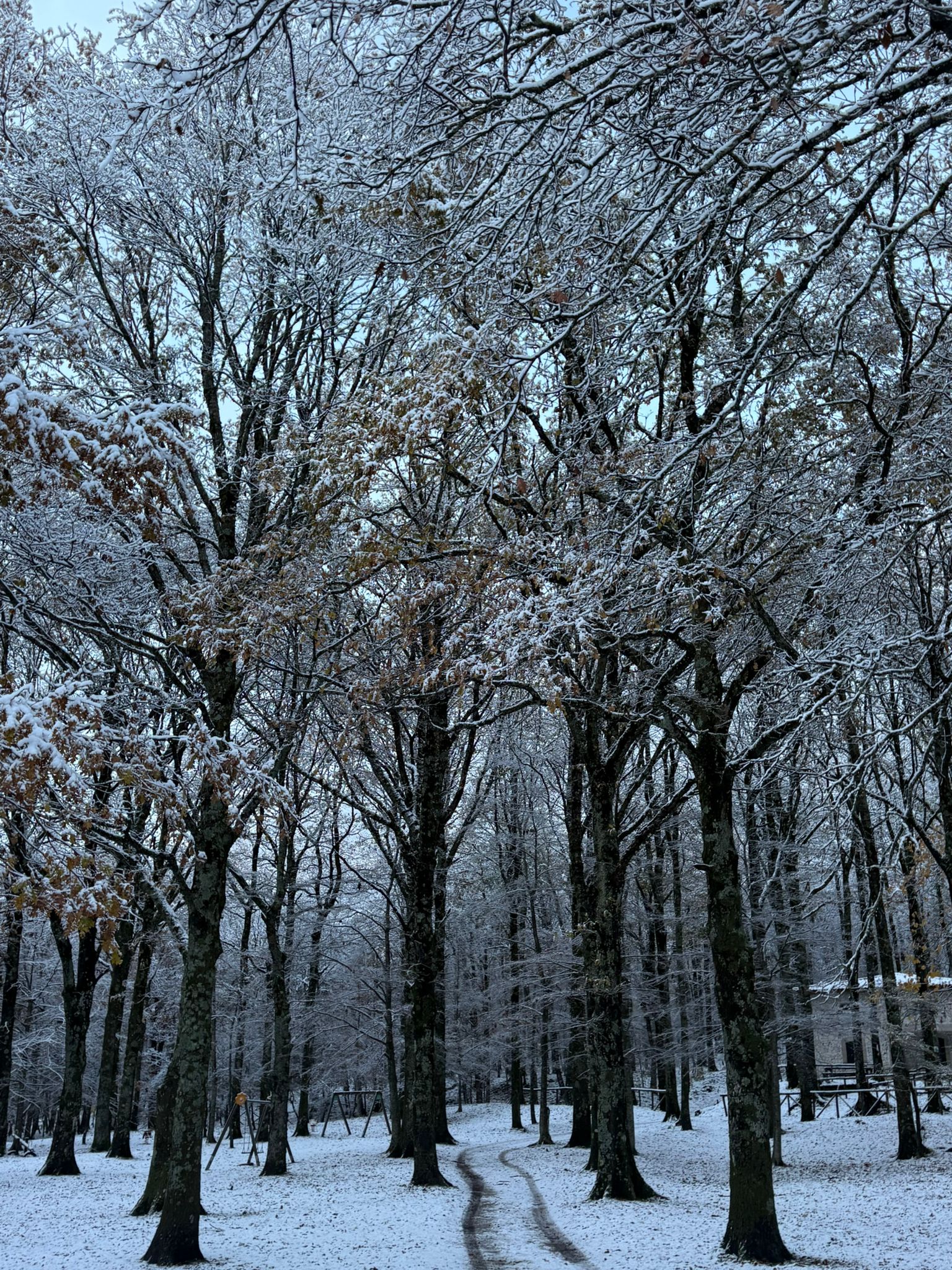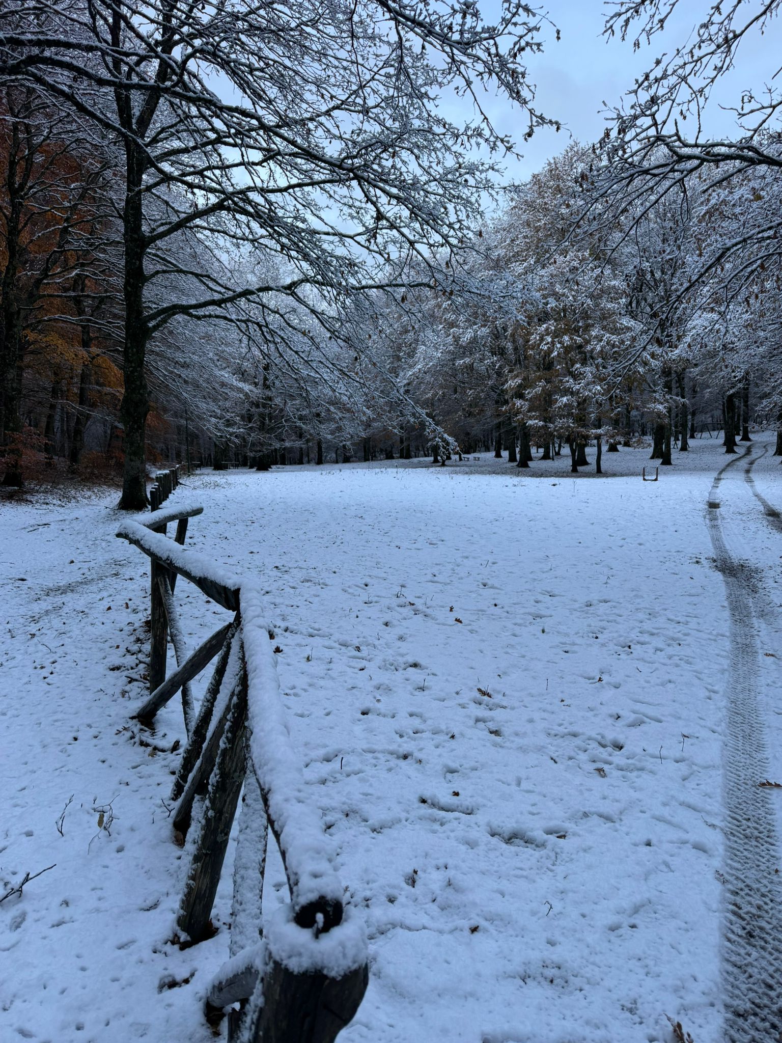 La nevicata, pur non abbondante, ha ridato vita ai boschi e ai versanti del Parco, avvolgendoli in una cornice quasi fiabesca. I casotti di montagna, le strade sterrate e i prati hanno cambiato colore e ritmo, mostrando l’arrivo dell’inverno in tutta la sua delicatezza.