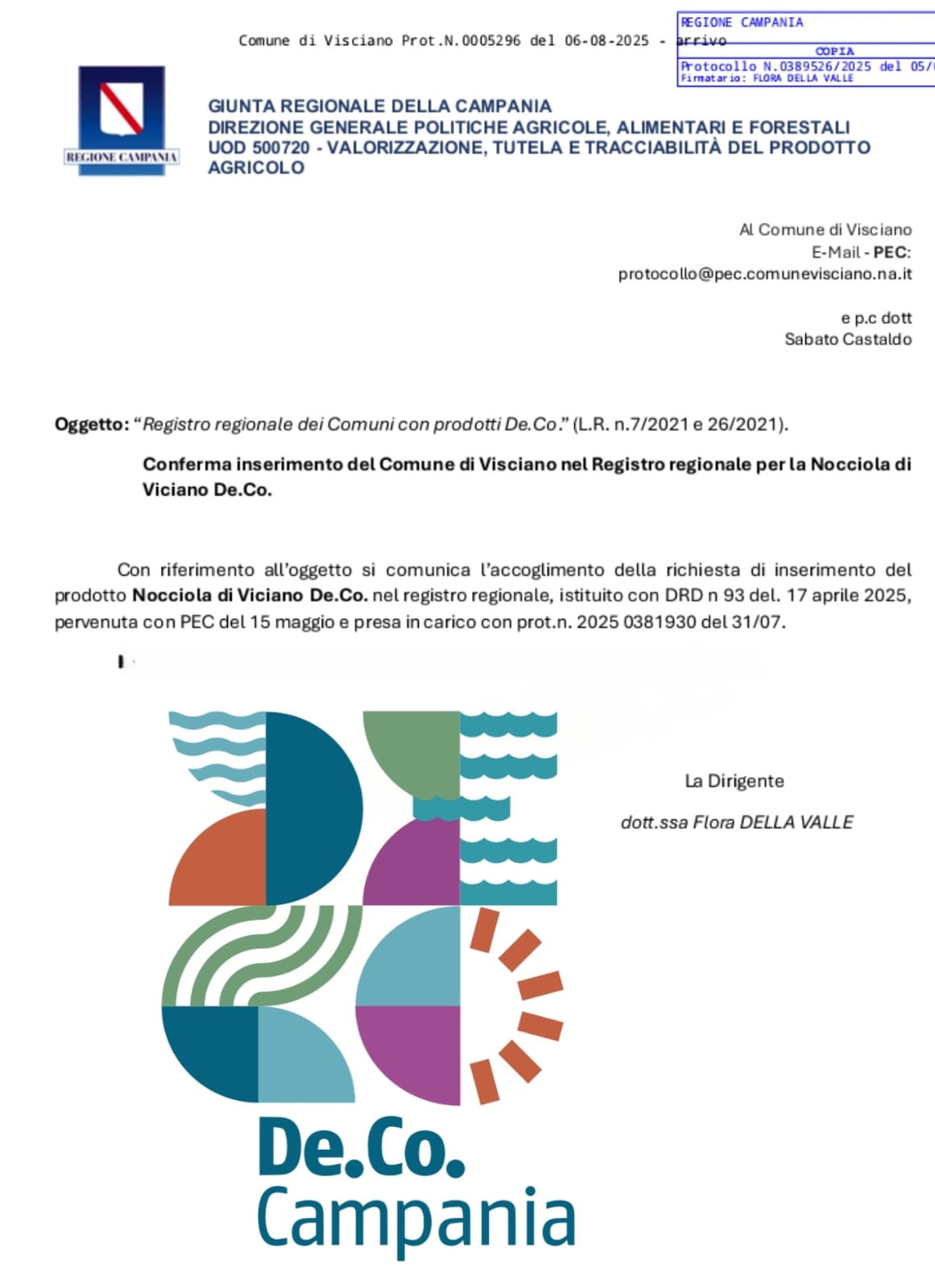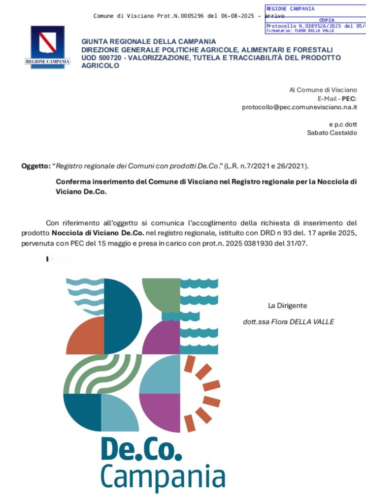 Visciano (NA) – È la Nocciola di Visciano il primo prodotto a entrare ufficialmente nel Registro Regionale delle Denominazioni Comunali di Origine (De.C.O.) della Campania. A comunicarlo è la Regione Campania, che ha approvato il provvedimento con numero di registrazione DE00001 e autorizzato l’uso del logo “De.C.O. Campania”.