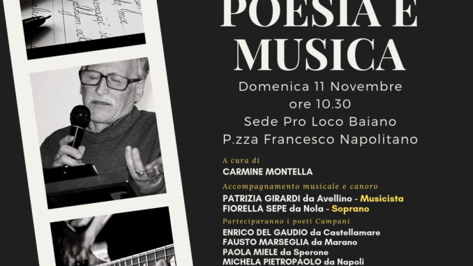 La Pro Loco Baiano, nell’ambito della sua attività di promozione culturale e sociale, promuoverà, domenica 11 Novembre alle ore 10.30, presso la propria sede, un reading di poesie, che farà da “apripista” ad una serie di eventi che si terranno a cadenza mensile. Nel prossimo week-end, dunque, Su invito di Carmine Montella, saranno ospitati poeti superpremiati in importanti premi letterari nazionali, che declameranno versi sia in italiano, sia in vernacolo, la lingua dalla particolare capacità espressiva che ha radici profonde nel nostro tessuto sociale. Sarà un vero piacere ascoltare le loro tematiche che certamente trasmetteranno emozioni forti e faranno vibrare le corde del cuore agli animi sensibili e predisposti a farsi irretire dalle Muse Euterpe e Calliope. Interverranno Enrico Del Gaudio da Castellammare di Stabia, Michela Pietropaolo da Napoli, Fausto Marseglia da Marano, Gino Abbro da Caserta, Ciro Iannone da Melito, Enzo Cerasuolo e Vincenzo Moccia da Marigliano, Antonella La Frazia da San Giorgio del Sannio, Antonio Covino da Napoli e Paola Miele da Sperone; poeti che impreziosiscono con la loro frequentazione prestigiosi salotti culturali della regione. L’evento poetico sarà arricchito dal canto potente e sopraffino del soprano Fiorella Sepe di Nola, dalla chitarra magistralmente suonata da Patrizia Gerardi di Avellino e dalla performance di Gennaro Noviello di Baiano che tornerà dopo molto tempo a cimentarsi con la declamazione di testi poetici con la sua voce calda e profonda. Lo spettacolo, curato da Carmine Montella, sarà certamente gradevole per l’ottimo livello degli artisti che hanno dato la loro disponibilità.