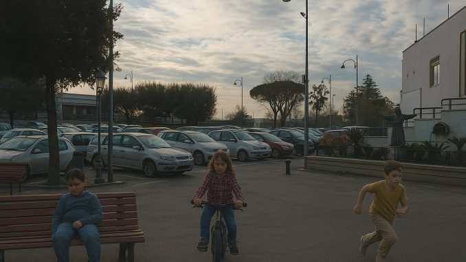 “Stiamo davvero lasciando un paese migliore ai nostri figli, o solo una periferia dell’anima?…con tanto di piazza girata a parcheggio, precludendo loro, in mezzo a tutto questo desolante scenario, anche la possibilità di giocare a calcio, rincorrersi o semplicemente assieparsi…come facevano prima?