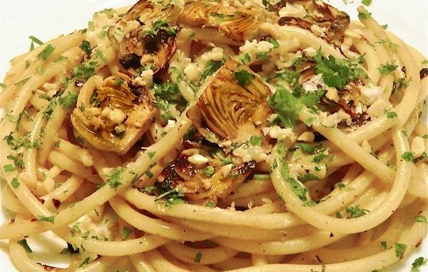 340 g di spaghetti, 6 carciofi, mezzo limone, prezzemolo, 250 ml circa di brodo vegetale, 2 spicchi d’aglio,olio extravergine di oliva, pepe, sale.