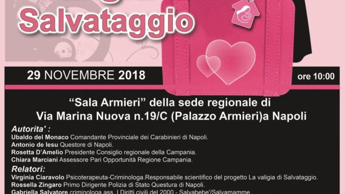 Il 29 novembre 2018, a Napoli, nella sala Armieri, alle ore 10.00, si terrà la conferenza stampa per la presentazione del progetto ” La valigia di salvataggio” progetto rivolto a tutte le donne costrette a scappare all’improvviso, di fronte ad agiti aggressivi di partner maltrattanti creato dall’Associazione Salvamamme.