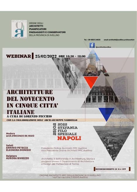 Proseguirà venerdì 25 febbraio alle ore 16.30, attraverso la piattaforma gotowebinar, il ciclo di incontri dal titolo “L’architettura del Novecento in cinque città italiane” a cura di Lorenzo Fecchio con la collaborazione dell’arch. Giuseppe Nardiello. Saranno trattate le architetture di Stefania Filo Speziale realizzate nella città di Napoli, analizzate dal punto di vista storico e compositivo, attraverso documenti e disegni di archivio. Interverranno Erminio Petecca, presidente dell’ordine irpino, Eleonora Dionisio, vice presidente dell’ordine, relazionerà Aurora Riviezzo, dottoranda in architettura, storia e progetto presso il dipartimento di architettura e design del politecnico di Torino. Modererà l’arch. Vincenzo De Maio.