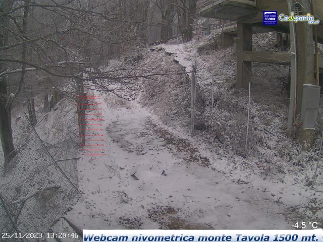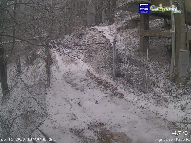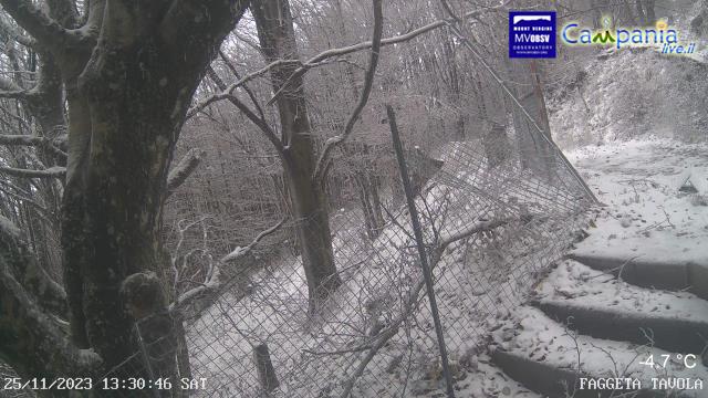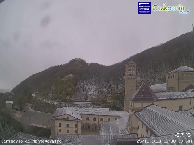 A Montevergine, nei pressi dell’abbazia, la neve ha già fatto la sua comparsa, dipingendo di bianco l’intera area e trasformando il luogo in una scena fiabesca. La sottile coltre bianca che si è formata attorno all’abbazia conferisce al panorama un’atmosfera magica e surreale, mentre gli alberi si vestono di bianco e i tetti delle case assumono un aspetto incantato.