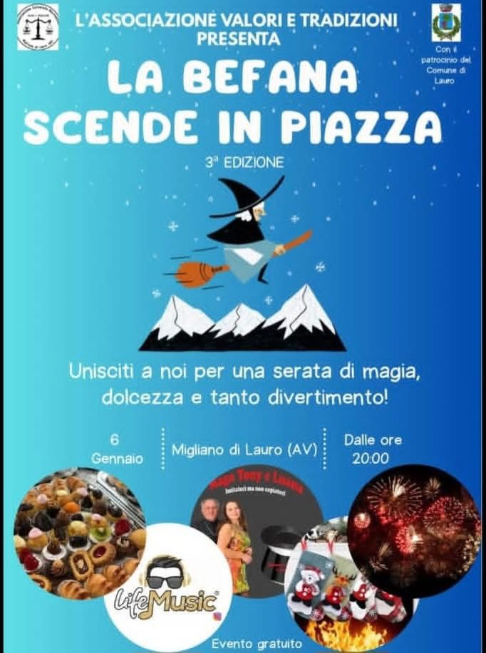Una serata all’insegna della dolcezza, della tradizione e della magia attende grandi e piccoli a Migliano di Lauro. Il prossimo 6 gennaio, a partire dalle ore 20.00, il cuore della frazione lauretana si animerà con la terza edizione de “La Befana scende in piazza”, evento pensato per salutare le festività natalizie in un clima di allegria e condivisione.