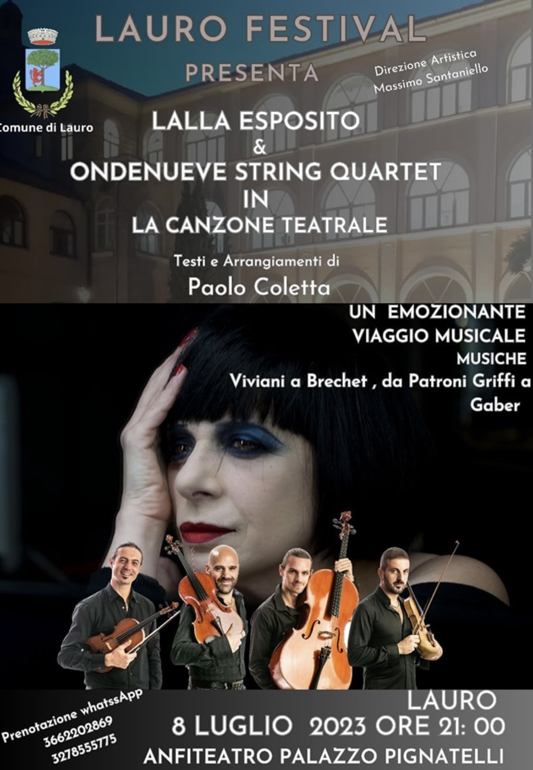 Il cartellone estivo del Comune di Lauro (AV) presenta per il 2023 una serie di appuntamenti prestigiosi e così dopo il successo di “Lauro incontra Praga” , concerto dell’ orchestra sinfonica del Conservatorio di Praga, Palazzo Pignatelli è pronto ad ospitare un nuovo evento di qualità: negli splendidi giardini del sito rinascimentale andrà in scena sabato 8 luglio a partire dalle ore 21.00 “La Canzone Teatrale” con Lalla Esposito e gli Ondanueve String Quartet, un concerto per voce e quartetto d’archi che nasce dalla collaborazione tra una cantante-attrice, tra le più autorevoli interpreti di Teatro Musicale del nostro Paese e l’autore, regista e musicista Paolo Coletta.