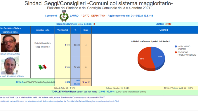 Lauro ha un nuovo sindaco, Rossano Sergio Boglione che amministrerà l’ente con la seguente maggioranza: