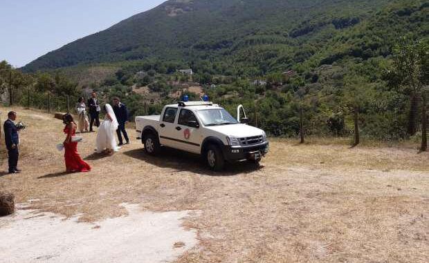 La strada non percorribile ha visto la sposa a ricorrere all’aiuto dei suoi colleghi della protezione civile, che con il pick-up dell’Associazione “Amici di Laviano” ha risposto all’appello Arcangelo Torluccio che ha accompagnato gli sposi fino all’ingresso delle porte normanne, risparmiando così la strada pedonale ripida e sconnessa.