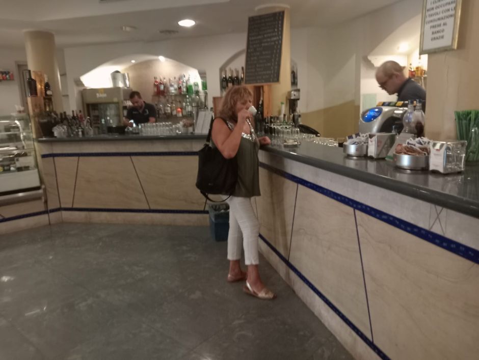 Ciò premesso, chi vuole prendere un caffè , o un caffè con orzata e pasticcini annessi, in uno dei bar, sia in piazza che nella parte sottostante, deve scegliere , se essere servito a tavolino o consumare al banco, perché ogni esercizio ha all’esterno i prezzi affissi.