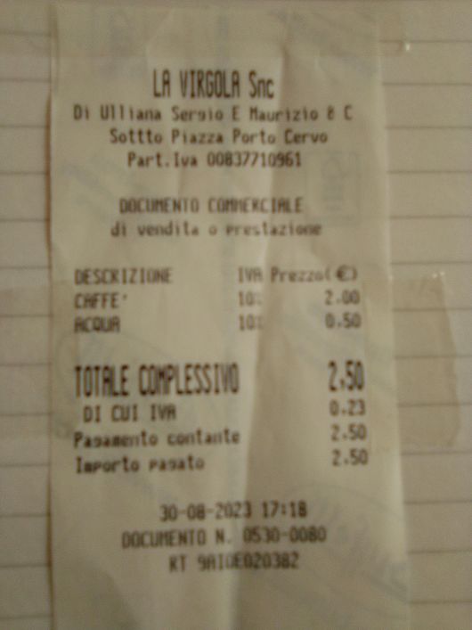 Lei quanto ha pagato il caffè oggi il caffè. Questo periodo di agosto, sono venuta più d una volta a questo bar, e ho sempre pagato il caffè 2 Euro. Oggi avendo eccessiva sete, ho preso anche un bicchiere grande di acqua, pagandolo 0,50 Eur, il tutto come da scontrino di ricevuta.