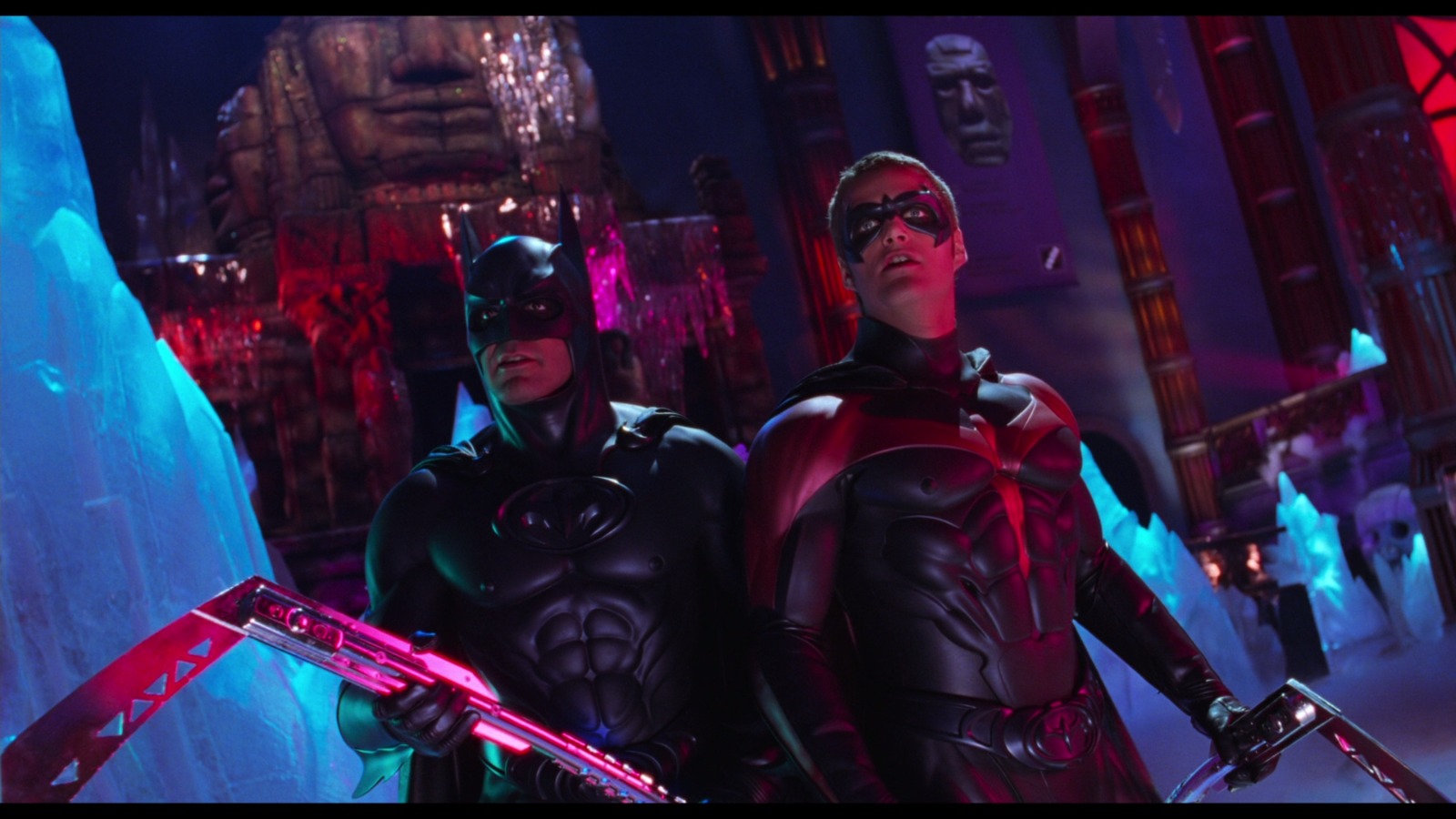 Aggiungici dei capezzoli ai costumi (a detta del regista l’intento era quello di richiamare alla sculture greche e ai loro canoni estetici con corpi a dir poco perfetti), accentua ancor di più le atmosfere fumettistiche della pellicola precedente, satura ancor più i color già sgargianti e avrai “Batman & Robin”: la perfetta trasposizione cinematografica di ciò che Batman non è.